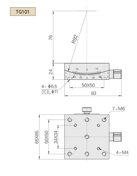 型號 TG101 臺面尺寸(mm) 65×65 角度范圍 ±10o 最小讀數(shù) 5' 最小刻度 1o 傳動比 352 中心高(mm) 76 負載(kg) 6 自重(kg) 0.6