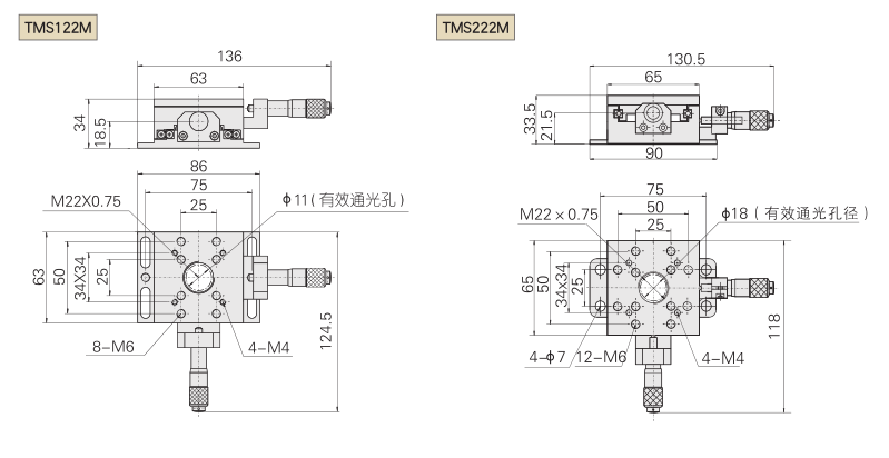 TMS122M采用交叉滾珠導軌,直線性好 TMS222M采用線性滾珠導軌,精度高 微分頭驅動 中心有通光孔