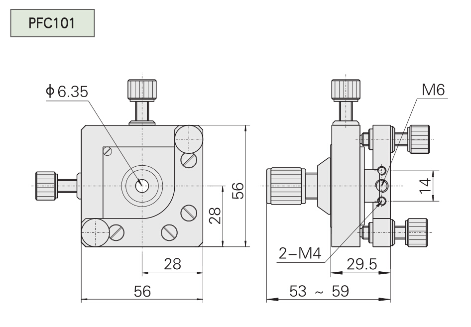 五維調整光纖 手輪調節Tx,M6×0.25 細牙螺桿調節其余四維 中心φ6.35mm 通孔,可裝卡PFA101、PFA102 型光纖卡頭