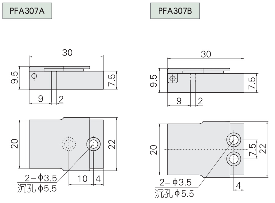 兩V形槽夾125-250μ單模光纖,磁性壓緊不傷光纖 用2-M3 螺釘,有兩種安裝孔位