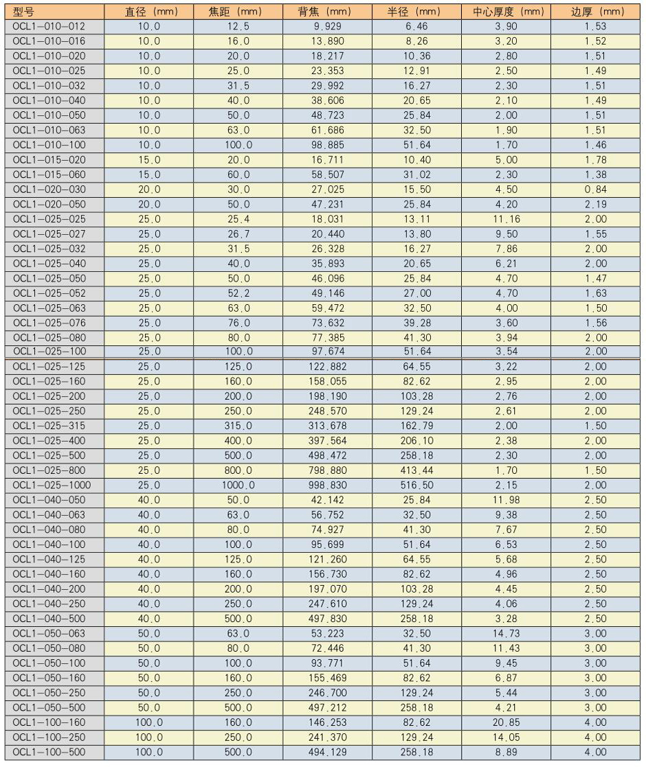 · 材料:精退火 K9 光學玻璃或紫外熔石英 · 焦距誤差:±2% · 設計波長:587.6nm · 中心厚度誤差:±0.2mm · 透鏡定心誤差:<3 分 · 直徑誤差:+0.0/-0.1mm · 面型:<λ/4@632.8nm · 表面光潔度:3 ~ 4 級 · 倒邊:0.2mm×45°