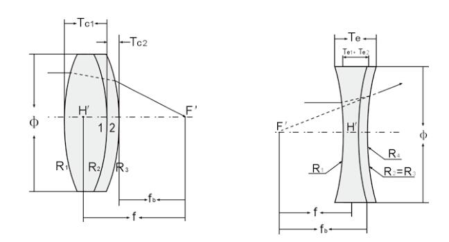 尺寸圖說明: Φ- 直徑,R1- 半徑,Tc- 中心厚度,Te- 邊厚,f- 焦距,fb- 背焦